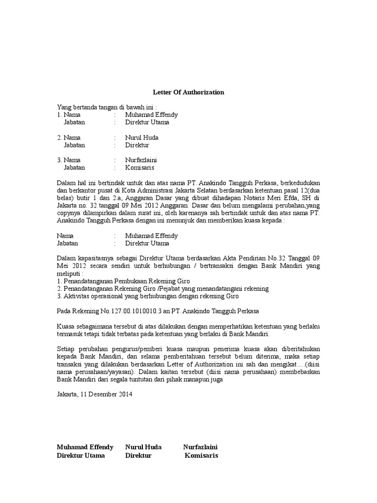 Contoh Surat Letter Of Authorization Bank Mandiri Kumpulan Surat Penting