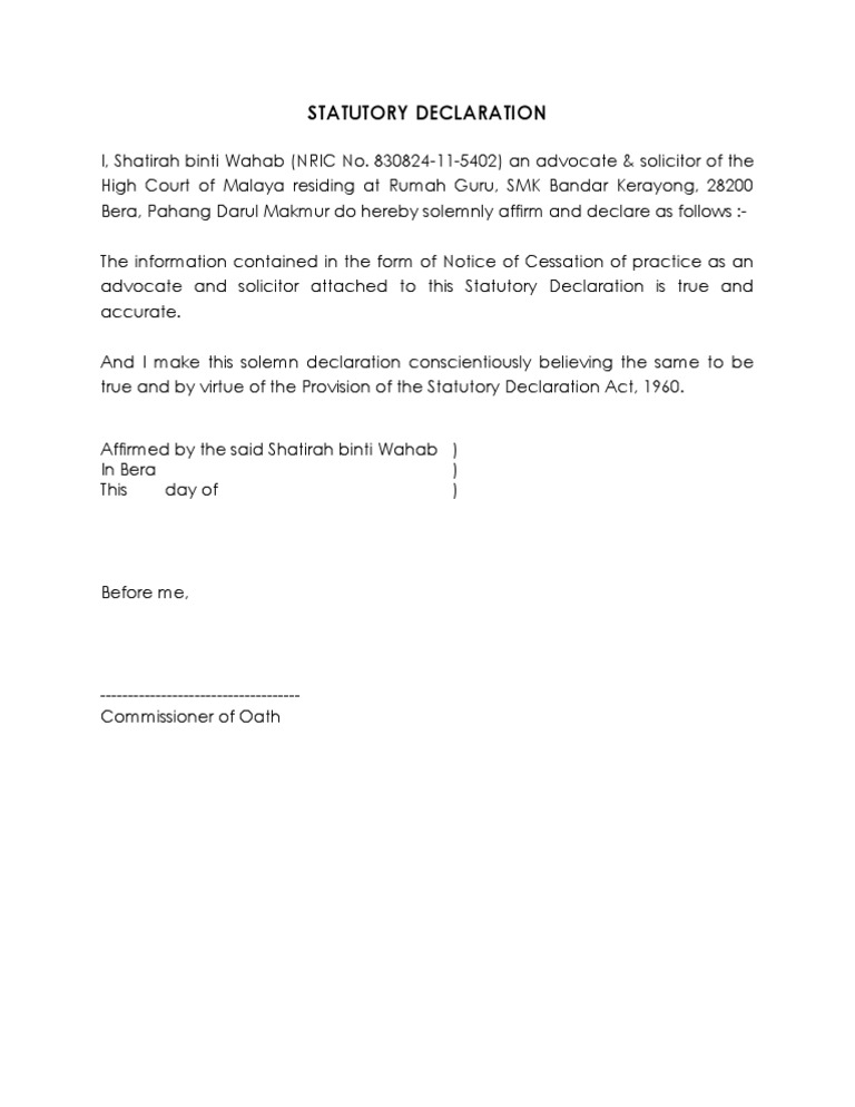 Statutory Declaration Format Under Stat Decl Act Malaysia Notary Public