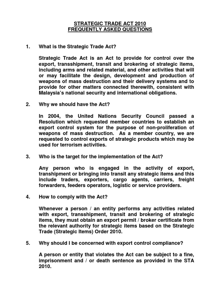 Strategic Trade Act Frequently Asked Questions 1 Tariff Exports